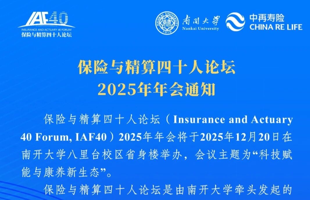 保险与精算四十人论坛2025年年会举行 南开新闻网讯(通讯员 郭志强)12月20日,由南开大学主办,南开-泰康保险与精算研究院、中国人寿再保险有限责任公司、南开大学经济学院联合承办的保险与精算四十人论坛2025年年会在南开大学八里台校区省身楼举行。各界嘉宾聚焦“科技赋能与康养新生态”主题,交流思想、汇聚智慧,共同探索保险与科技、康养、医药产业深度融合的发展新路径。 党的二十届四中全会明确提出“健全多...