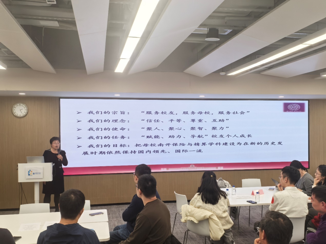 常务理事/南开-泰康保险与精算研究院院长李秀芳介绍了南开保险与精算学科发展的最新动态。李老师特别强调了学科发展与校友成长是相互成就的关系,这种相互成就的关系过去是,现在是,永远都是。学校对保险与精算学科的发展高度重视,对学科建设寄予厚望。研究院在学术交流、科学研究、师资引进、学生培养等各方面都做了很多努力,未来不仅要不断扩大学科影响力,更重要的是要把学科做实做好,把学科品牌擦得更亮。李老师欢迎校友们常回母校看看、对母校学科建设、学生培养给予力所能及的支持,学科的发展成就了校友的事业,另一方面,校友在各自领域中取得的突出成绩也成就了母校的学科声誉,成为学科发展的重要支撑。