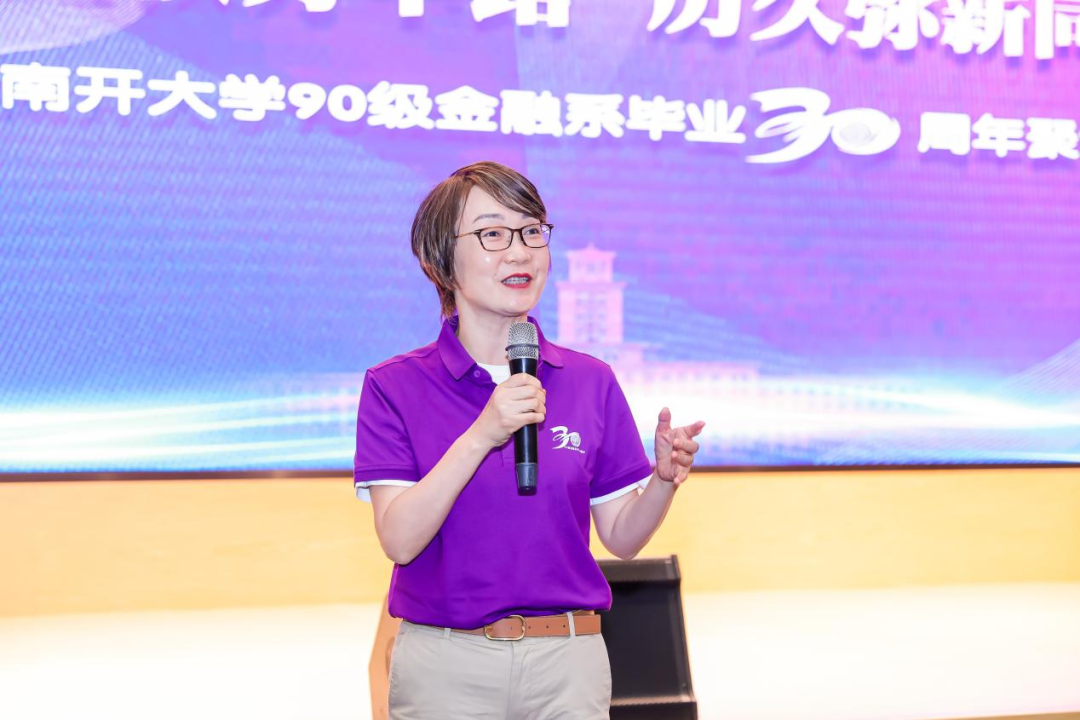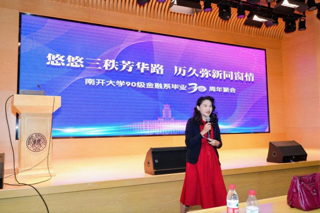 曾讲授《海商法》和《保险英语》的刘玮老师深情回忆了与1990级同学们的校园时光,表示为同学们三十年来在金融、保险领域取得的卓越成就感到骄傲。她鼓励同学们在新发展阶段、在新的发展形势下,通过加强政产学研合作,发展产教融合人才培养创新模式,在我们各自的岗位上担当作为、勇于创新、协同发展,为南开保险和精算学科发展与人才培养,为助力中国式现代化建设,贡献南开人的智慧和力量。