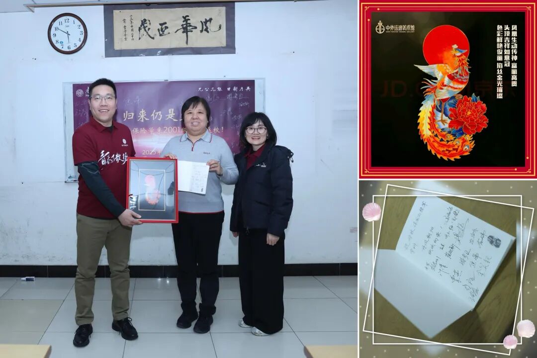 座谈会的最后,举行了简朴而深情的赠礼仪式。焦峰、齐红梅同学代表2001级保险本科全体校友,向母校保险与精算学科敬赠毕业二十周年纪念品,由 李秀芳老师代表保险与精算学科接受。这份礼物承载着学子们对母校母院的深深祝福,祝愿学科丹凤朝阳,欣欣向荣。李秀芳老师代表母校保险与精算学科,衷心感谢2001级保险本科全体同学对母校的深情厚谊。她 希望各位校友能一如既往地关心、支持母校保险与精算学科的发展,母校也将不懈推进学科建设与创新,让南开保险精算的品牌更加闪亮。她深情表示,母校永远是大家坚强的后盾,将持续为大家构筑好、守护好这片在南开园里的精神家园与物理家园。
