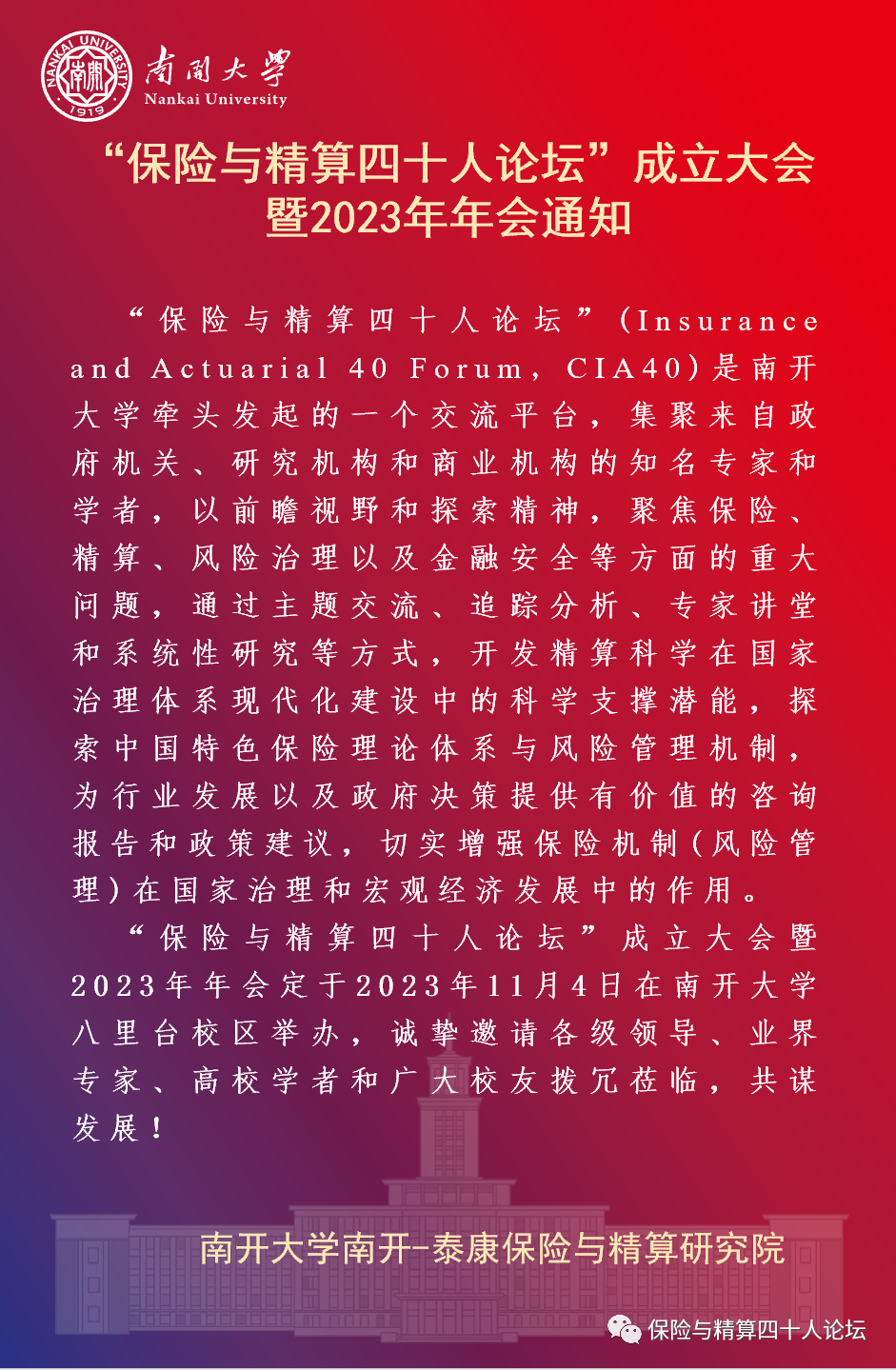活动预告 | “保险与精算四十人论坛”成立大会暨2023年年会通知