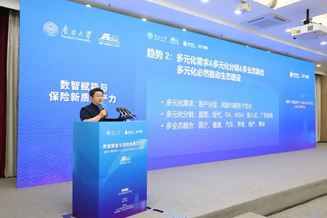 2025年6月14日,“保险与精算四十人论坛·青年论坛2025年年会”在南开大学八里台校区省身楼隆重举行。本次年会由南开大学主办,南开-泰康保险与精算研究院、蚂蚁逸康(广州)信息技术有限公司承办,主题为“数智赋能与保险新质生产力”,聚焦数字化时代保险行业的转型升级与高质量发展。论坛设置主论坛、三场分论坛及一场圆桌论坛。