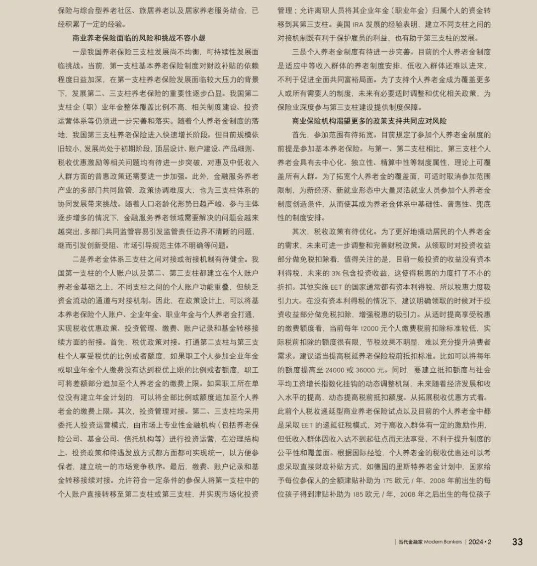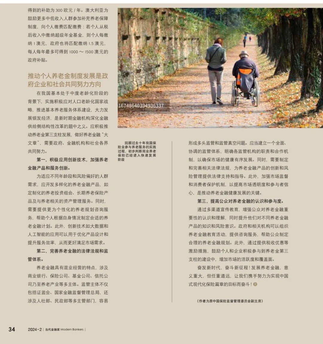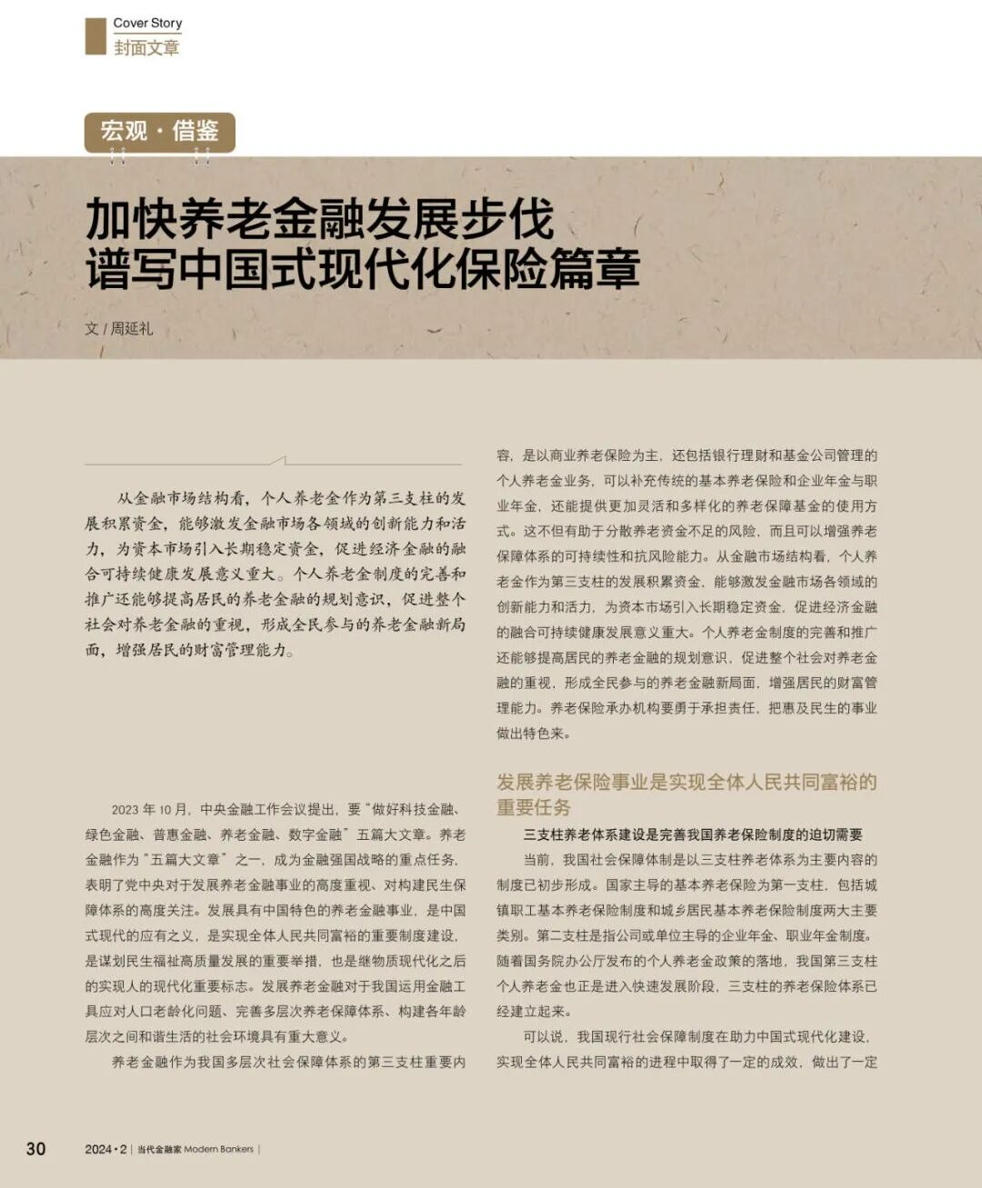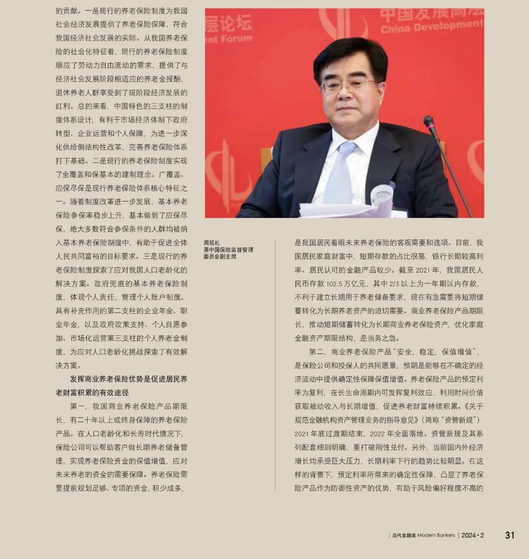 《当代金融家》杂志2024年2月刊发原中国保险监督管理委员会副主席,保险与精算四十人论坛学术委员会主席周延礼的封面署名文章《加快养老金融发展步伐,谱写中国式现代化保险篇章》。今天我们转载该文章,以飨读者。