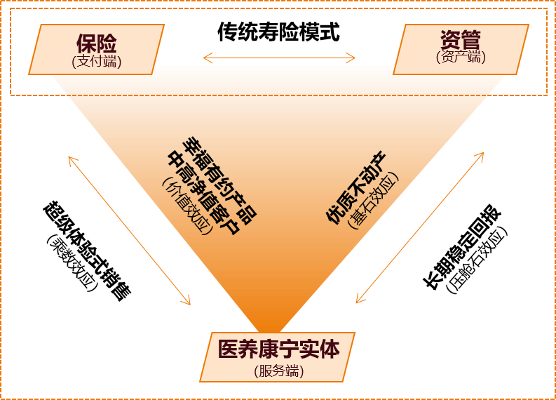 泰康方案将寿险业从过去的销售驱动转向服务驱动,将传统寿险以队伍为核心转向以客户为中心。在传统寿险“产品、客户、队伍(渠道)”的“金三角”中,寿险公司的经营逻辑是以“队伍”为核心,通过经营销售队伍来服务客户。泰康将实体医养服务引入传统寿险,以基于客户需求的服务来推动传统寿险销售,改变了寿险业传统的经营逻辑。