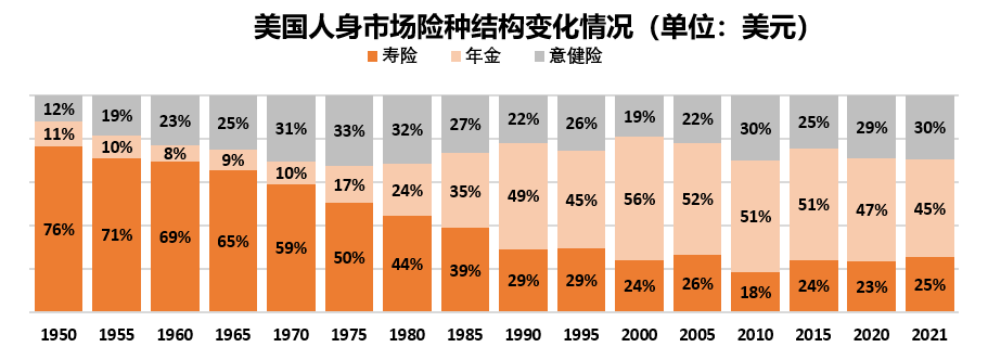 美国是全球最大的人身险市场,目前已经形成传统寿险、年金和健康险三足鼎立的格局。但传统寿险产品保费收入占人身险保费的比重从1950年的76%,降低到2010年的18%,最近十年才稍有提升到25%左右。而年金和意外及健康险占比则持续提升,分别从1950年的11%和12%,提升至2021年的45%和30%。同时,寿险公司在美国个人退休金市场和商业意外及健康险市场所占份额也一直在下降。商业意外及健康险市场方面,2021年寿险公司仅占16%,健康险公司占84%;在个人退休金市场,到2022年寿险公司所占份额仅为5%,主要被共同基金、证券和信托公司瓜分。