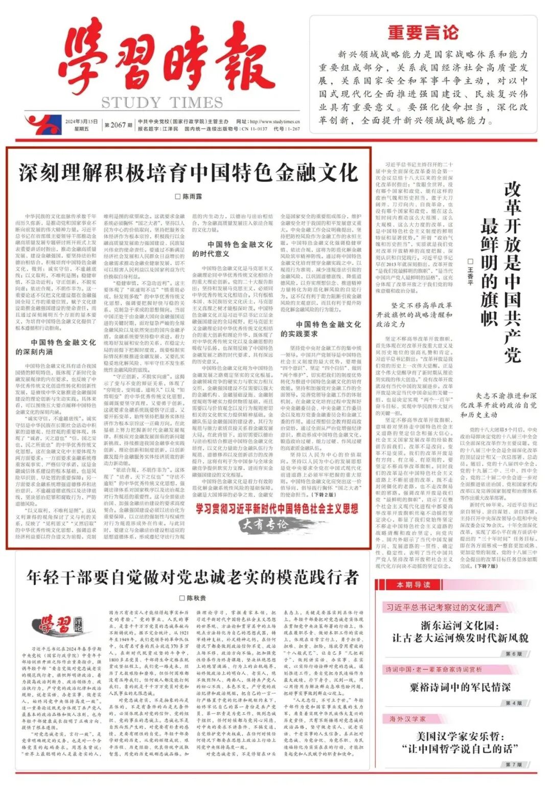 《学习时报》2024年3月15日第1版刊发了南开大学校长、保险与精算四十人论坛主席陈雨露的文章《南开大学校长陈雨露:深刻理解积极培育中国特色金融文化》。