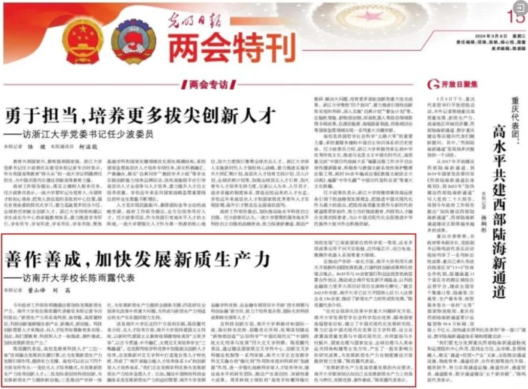 3月6日,《光明日报》“两会特刊”刊发专访报道《善作善成,加快发展新质生产力——访南开大学校长陈雨露代表》。陈雨露在接受专访时表示,发展新质生产力是高质量发展的内在要求。南开大学要深刻认知自己在发展新质生产力上的角色与责任,发挥优势,善作善成。